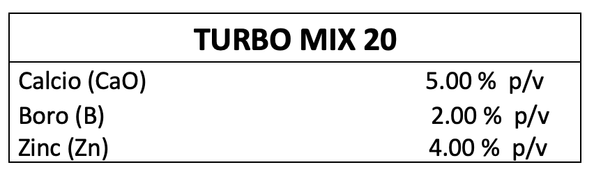 TURBO MIX 20 es una fórmula líquida completamente hidrosoluble y balanceada, desarrollada para suministrar Zinc, Boro y Calcio, tres micronutrientes esenciales para una agricultura eficiente. Enriquecido con aminoácidos naturales de origen vegetal, este producto asegura una rápida absorción y efectividad en la corrección de deficiencias críticas en todo tipo de cultivos.